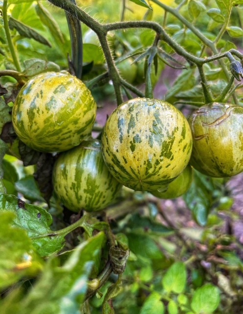 Green Zebra – Mittelgroße Tomate mit grüner Grundfarbe und gelblichen Streifen. Frisch-säuerlich im Geschmack, festfleischig und dekorativ.