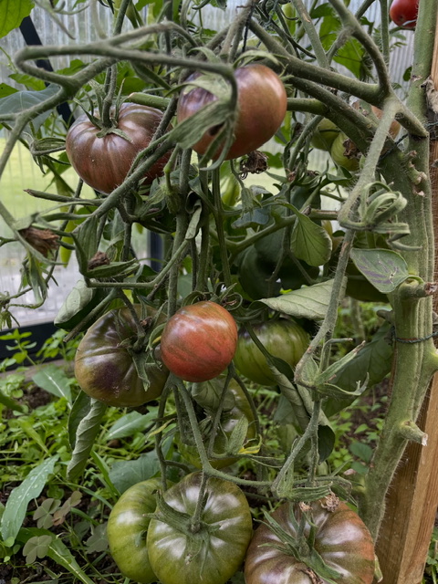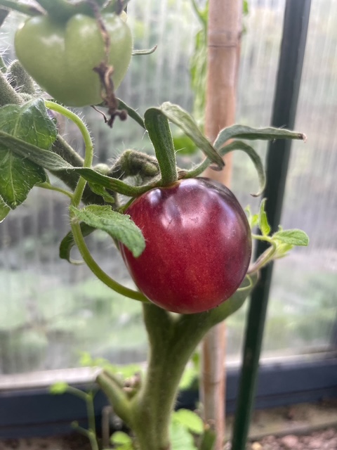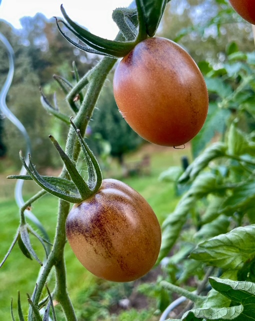 Cherokee Purple Cherry – Seltene, dunkle Cherrytomate mit violett-rotbrauner Schale. Süß-würzig, komplexes Aroma, reichtragend.