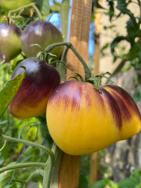 Bartie Blue – Große, rundliche bis leicht abgeflachte Tomate mit blau-violetter Schale. Aromatisch, mild-süß, saftig,