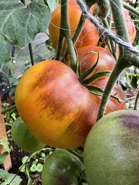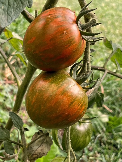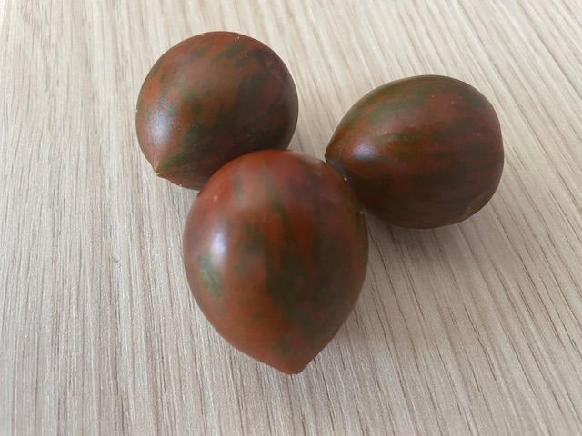 Black Zebra – Mittelgroße bis große Tomate mit dunkelrot-brauner Schale und grünlichen Streifen. Intensiv aromatisch, süß-würzig.